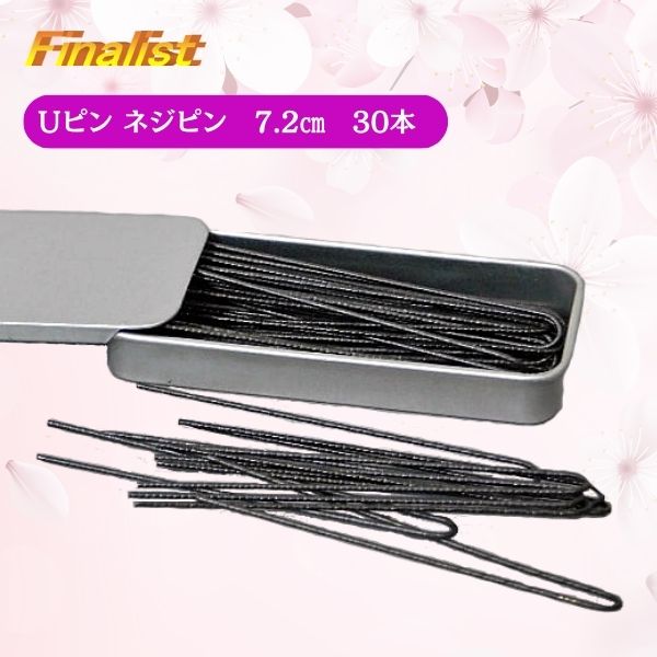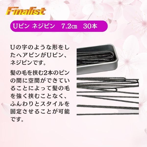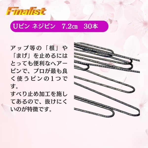 | 用途 | ヘアアレンジの際に使用をします。シニヨン、アップ等の「根」や「まげ」を止めるにはとっても便利なヘアーピンで、プロが最も良く使うピンの1つです。リボン、ヘアーアクセサリー止めにとても便利です。サロンで最も使われるピン。 すべり止め加工を施してあるので、抜けにくいのが特徴です。 |