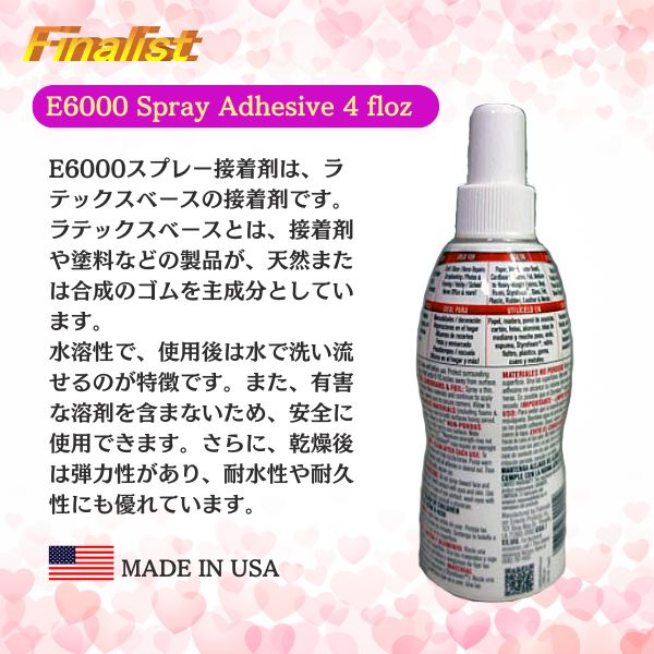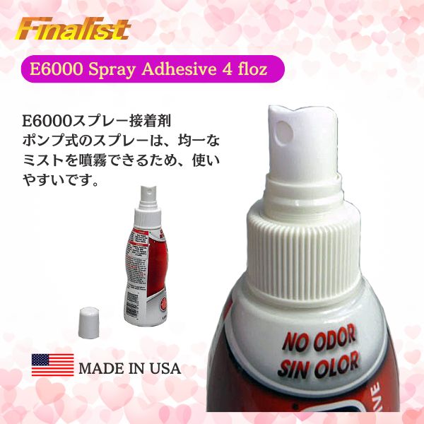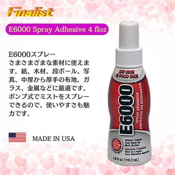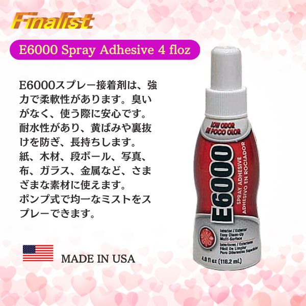 | 商品 | ファブリックには、E6000接着剤が最適です。 E6000-ASは、米国製品でファブリック、フェルト、金属、木材、ガラス、ゴムなど幅広い用途の超強力接着剤です。。 |